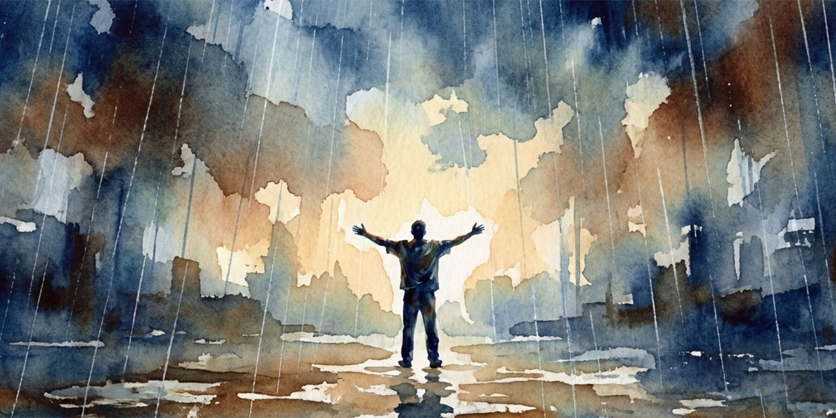 降りしきる雨の中で両手を広げる姿は、苦難ではなく祝福の象徴です。